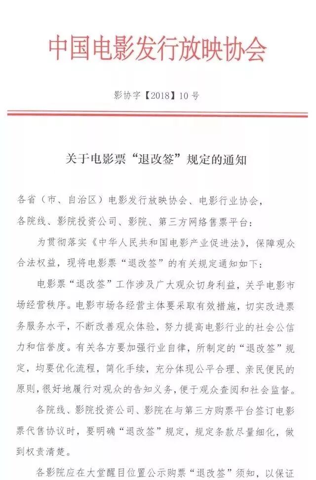 2018年9月,中国电影发行放映协会发布关于《电影票“退改签”规定的通知》,明确具体的电影票“退改签”措施。