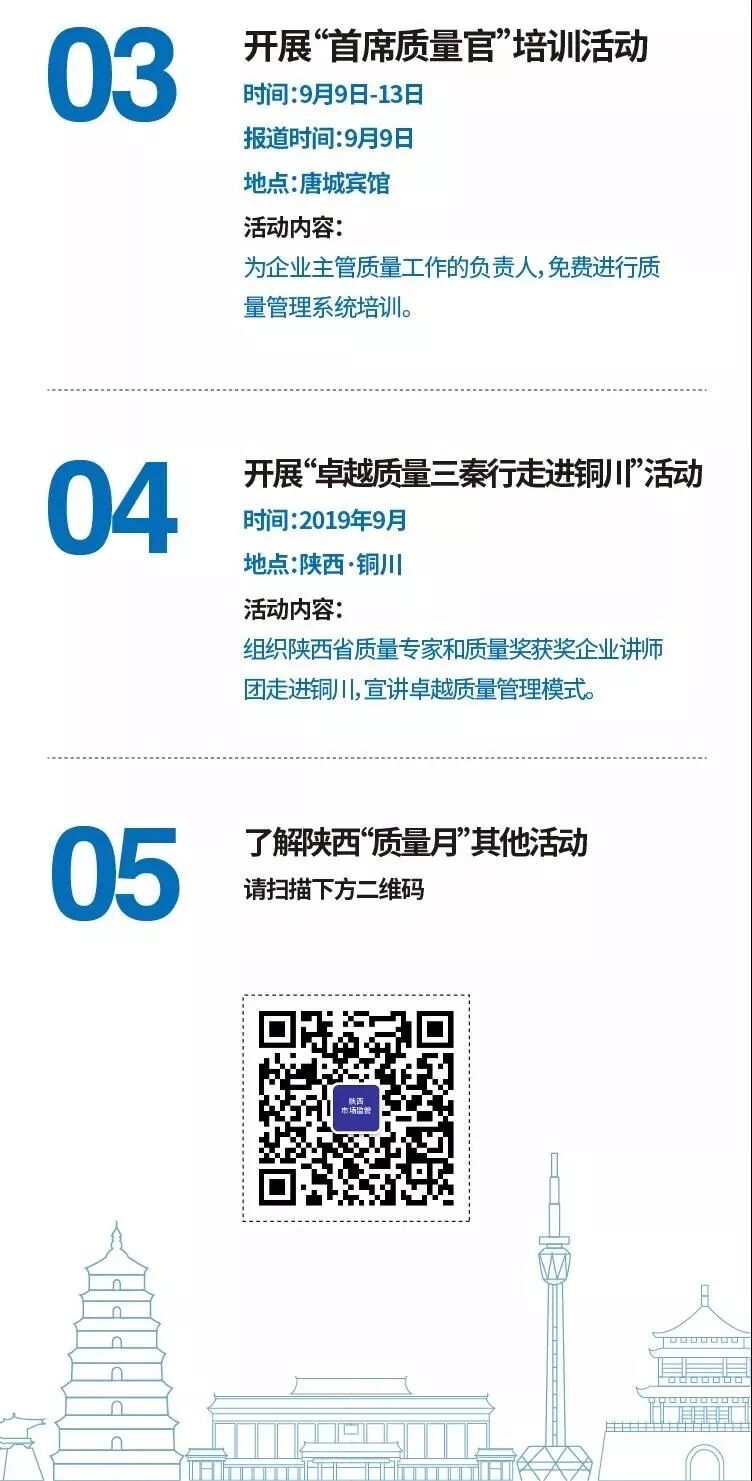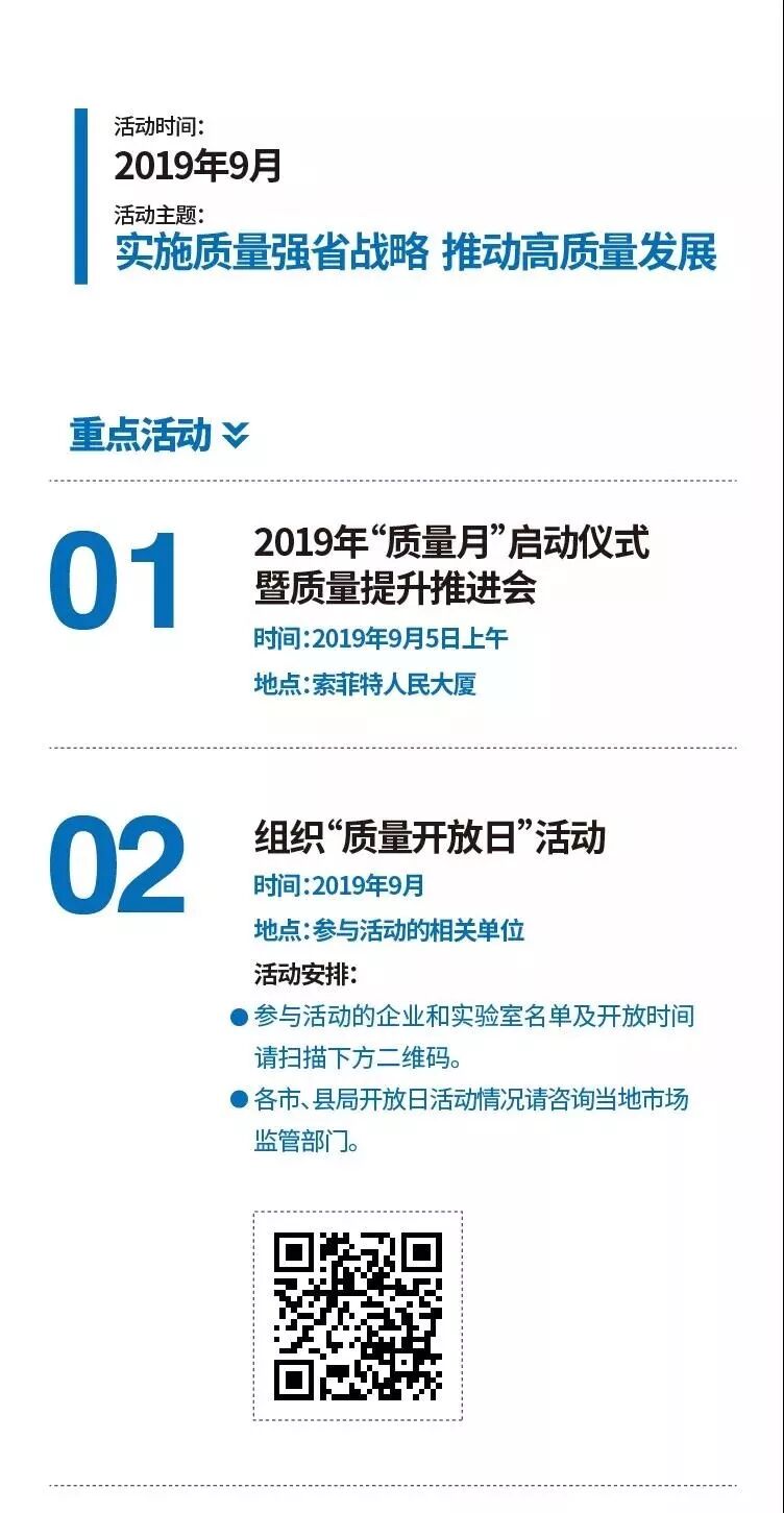 将开展2019年全省“质量月”活动启动仪式暨质量提升成果展、“2019年全省质量月宣传咨询服务日”、“质量月”在线访谈、“质量开放日”等活动。